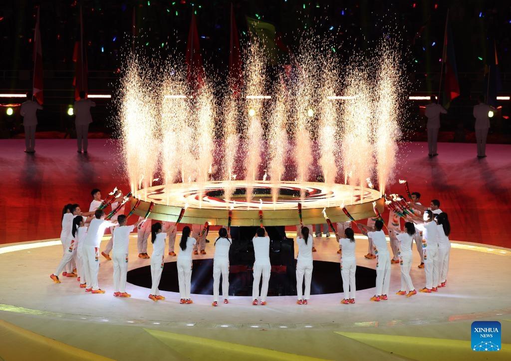 Cauldron is lit during the opening ceremony of the 31st FISU Summer World University Games in Chengdu, southwest China's Sichuan Province, July 28, 2023. (Xinhua/Jiang Hongjing)