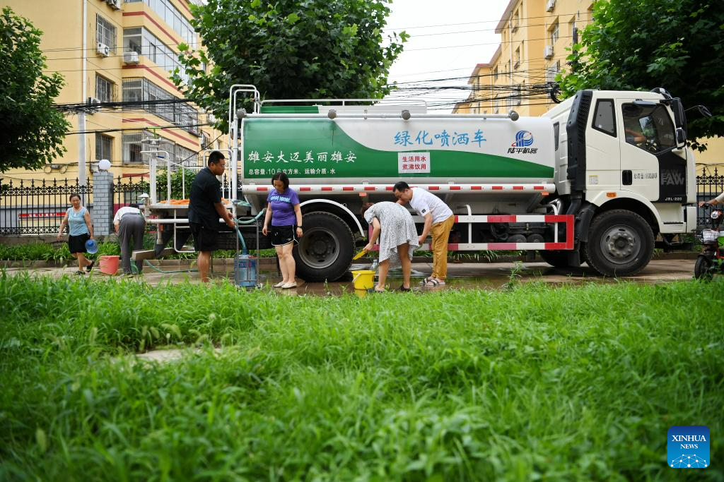 Residents draw water from a water supply vehicle in Zhuozhou, north China's Hebei Province, Aug. 4, 2023. Zhuozhou City is an area in Hebei that has been severely affected by rain-triggered floods. To relieve the water shortages that face the residents, the city has so far set up two temporary water supply points which are capable of making and outputting water. (Xinhua/Mu Yu)