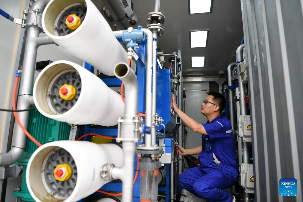 A staff member works at a temporary water supply point in Zhuozhou, north China's Hebei Province, Aug. 4, 2023. Zhuozhou City is an area in Hebei that has been severely affected by rain-triggered floods. To relieve the water shortages that face the residents, the city has so far set up two temporary water supply points which are capable of making and outputting water. (Xinhua/Mu Yu)