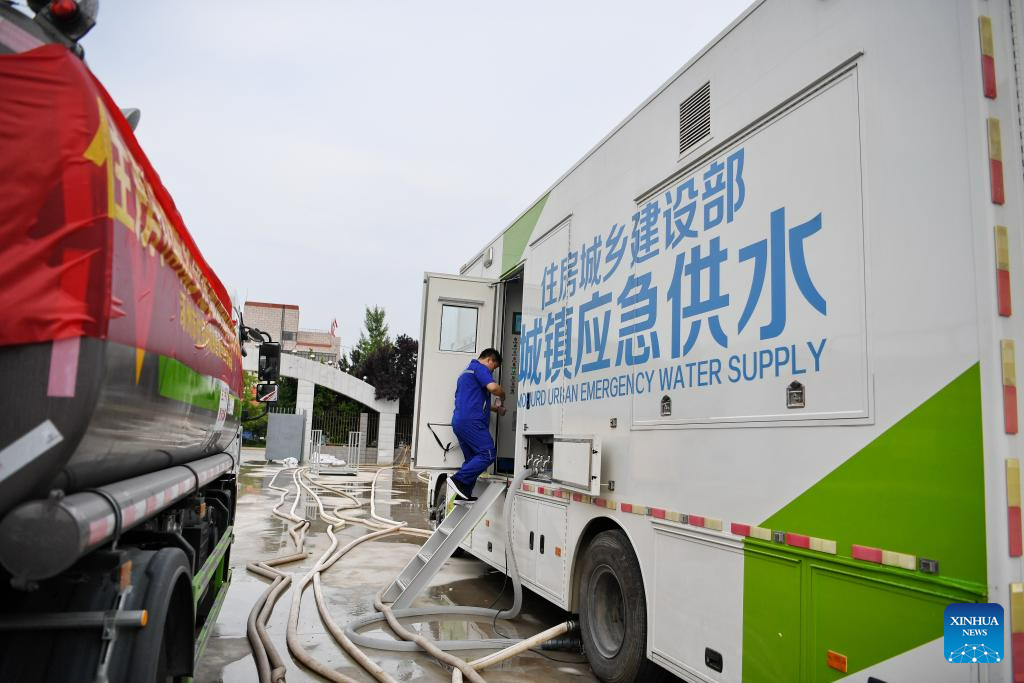 Water production vehicles are seen at an emergency water supply point in Zhuozhou, north China's Hebei Province, Aug. 4, 2023. Zhuozhou City is an area in Hebei that has been severely affected by rain-triggered floods. To relieve the water shortages that face the residents, the city has so far set up two temporary water supply points which are capable of making and outputting water. (Xinhua/Mu Yu)