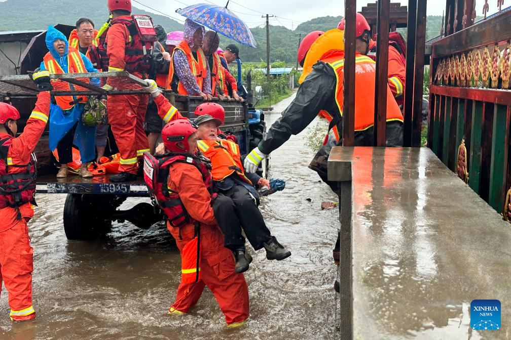 Firefighters rescue stranded villagers in the flood-affected Shangzhi City of Harbin, northeast China's Heilongjiang Province, Aug. 4, 2023. As heavy rainfall hit Shangzhi City and rising water levels of the Mayi River caused waterlogging in parts of the city, members of the Harbin forest fire brigade are charged with rescue tasks such as embankment in flood-affected areas and evacuation of stranded residents. (Xinhua)