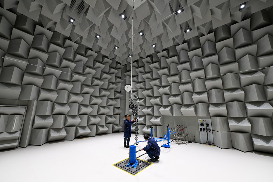 This photo taken on May 10, 2023 shows staff members working at a testing room at the Danfoss Global Green Refrigerants Compressors Laboratory in Tianjin, north China. (Xinhua/Sun Fanyue)
