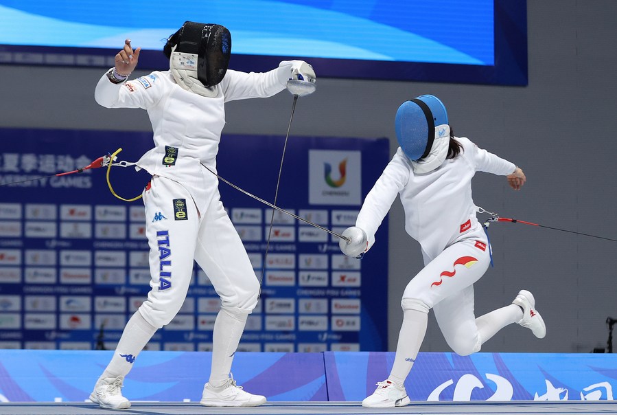 China's Tang Junyao (R) competes against Italy's Gaia Traditi during the women's epee team final at the 31st FISU Summer World University Games in Chengdu, southwest China's Sichuan Province, Aug. 5, 2023. (Xinhua/Qi Xiaoyi)
