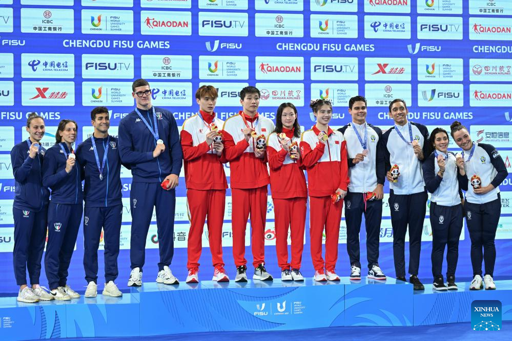 Gold medalists Team China (C), silver medalists Team Italy (L) and bronze medalists Team Brazil attend the awarding ceremony for swimming mixed 4x100m freestyle relay at the 31st FISU Summer World University Games in Chengdu, southwest China's Sichuan Province, Aug. 5, 2023. (Xinhua/Chen Zeguo)