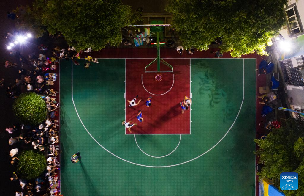 This aerial photo taken on Aug. 5, 2023 shows villagers competing during the basketball competition participated by local residents at Sanxing Village of Tangqi Town in Hangzhou, east China's Zhejiang Province, Aug. 5, 2023. (Xinhua/Xu Yu)