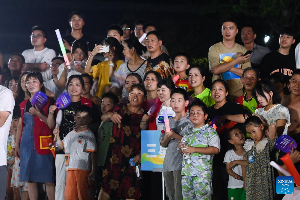 Villagers watch the basketball competition participated by local residents at Sanxing Village of Tangqi Town in Hangzhou, east China's Zhejiang Province, Aug. 5, 2023. (Xinhua/Xu Yu)