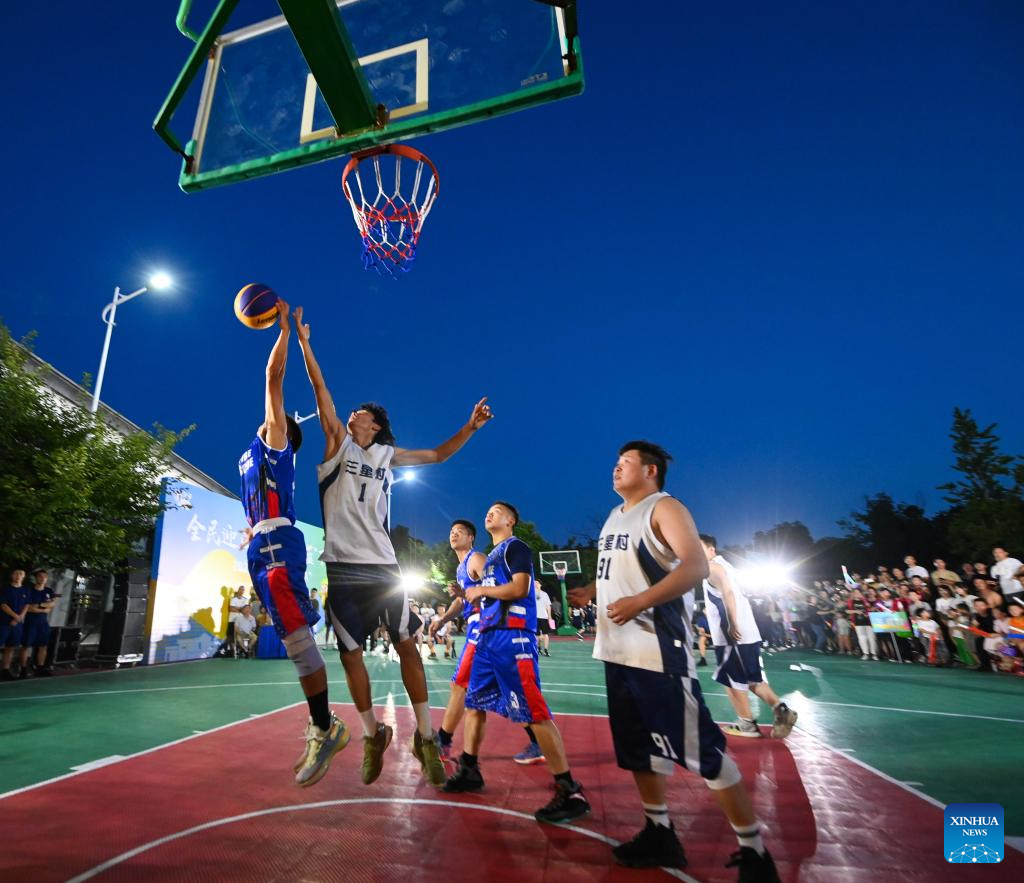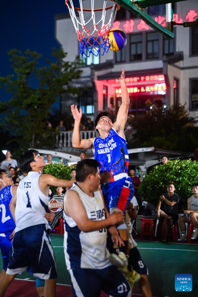 Villagers compete during the basketball competition participated by local residents at Sanxing Village of Tangqi Town in Hangzhou, east China's Zhejiang Province, Aug. 5, 2023. (Xinhua/Xu Yu)