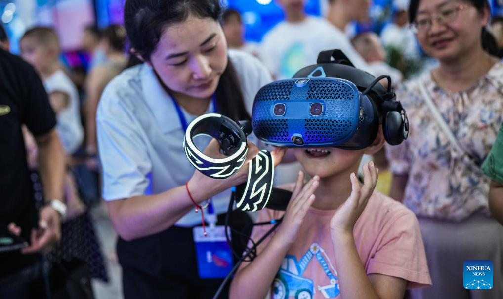 A child tries out a VR device during the first Guizhou Science and Technology Festival in Guiyang, southwest China's Guizhou Province, Aug. 5, 2023. The first Guizhou Science and Technology Festival kicked off at Guiyang International Conference and Exhibition Center on Saturday and will last till Aug. 9. (Xinhua/Tao Liang)