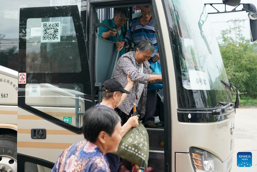 Villagers take a bus to leave a settlement site and return to their homes in Koutou Village of Qinglonghu Town in Fangshan District of Beijing, capital of China, Aug. 5, 2023. As this round of typhoon-induced torrential rains have come to an end in Beijing, some villagers of Fangshan District, who had been evacuated to settlement sites due to heavy rainfall over the previous few days, returned home on Saturday after experts assessed the safety of their residences.