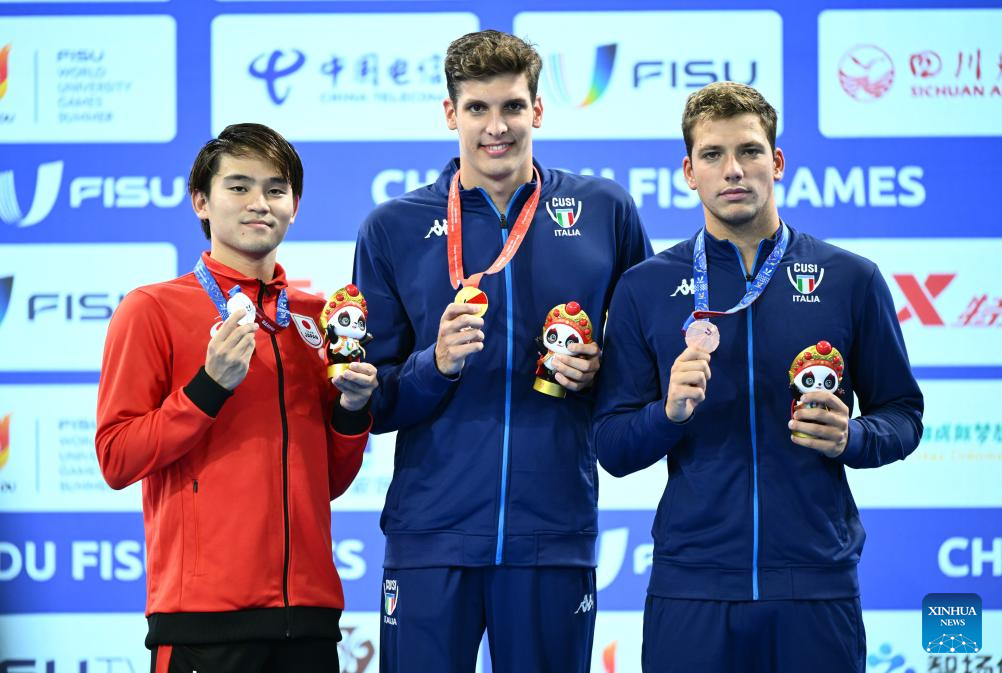 Gold medalist Matteo Lamberti (C) of Italy, silver mdalist Tabuchi Kaito (L) of Japan and bronze medalist Ivan Giovannoni of Italy attend the awarding ceremony for the swimming men's 800m freestyle at the 31st FISU Summer World University Games in Chengdu, southwest China's Sichuan Province, Aug. 5, 2023. (Xinhua/Wu Gang)