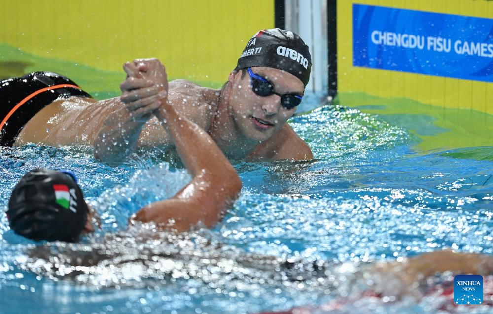 Matteo Lamberti (R) of Italy celebrates winning the swimming men's 800m freestyle final at the 31st FISU Summer World University Games in Chengdu, southwest China's Sichuan Province, Aug. 5, 2023. (Xinhua/Chen Zeguo)