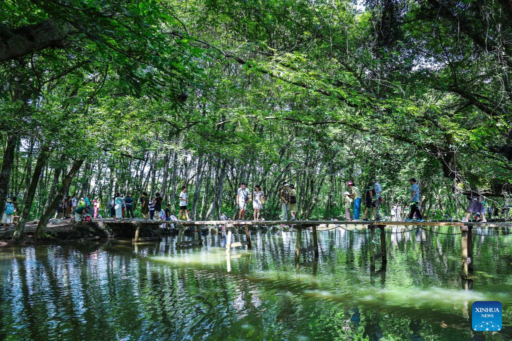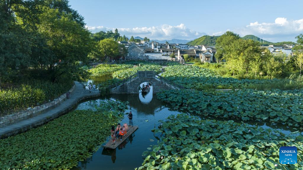 Tourists visit Xixinan Village in Huangshan City, east China's Anhui Province, Aug. 4, 2023. The ancient villages in Huangshan City witnessed a travel peak in summer. (Xinhua/Liu Junxi)