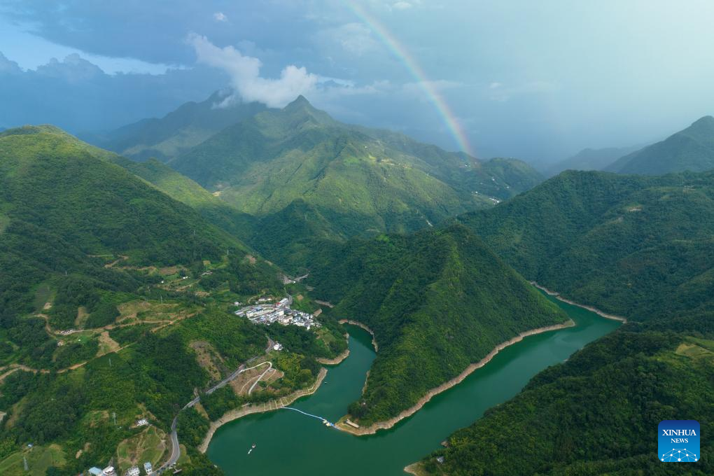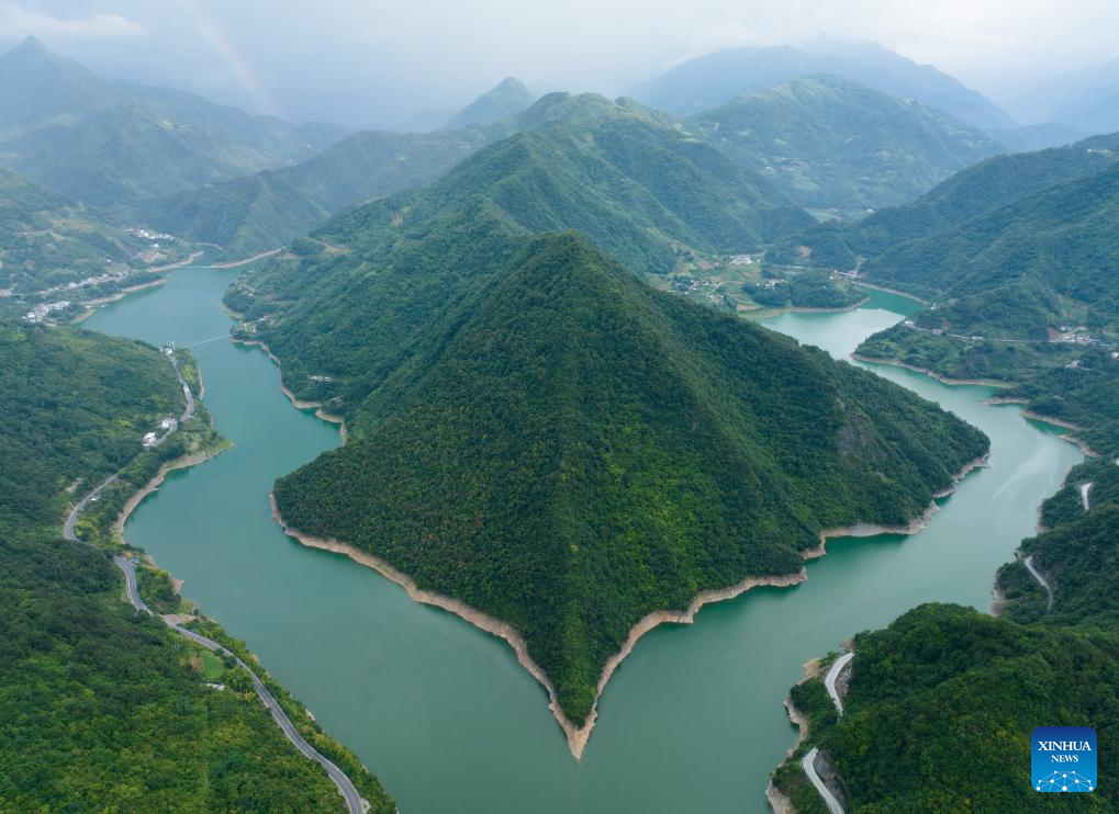 This aerial photo taken on Aug. 4, 2023 shows the scenery of Shenheyuan scenic spot in Langao County, northwest China's Shaanxi Province. Located in the Qinba mountains of Shaanxi, the county of Langao has utilized its natural and cultural resources in recent years to promote high-quality development through tourism industry. In the first half of 2023, the county received more than four million tourists, up 63.65 percent year on year. (Xinhua/Shao Rui)