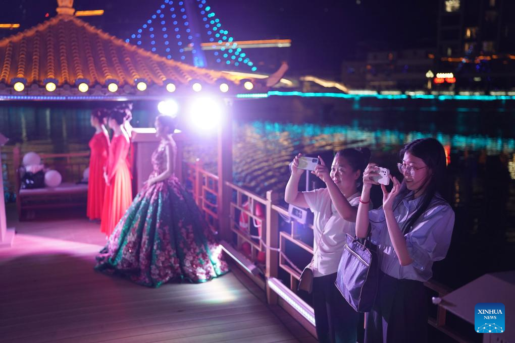 This photo taken on Aug. 3, 2023 shows a night view of Lanhe River in Langao County, northwest China's Shaanxi Province. Located in the Qinba mountains of Shaanxi, the county of Langao has utilized its natural and cultural resources in recent years to promote high-quality development through tourism industry. In the first half of 2023, the county received more than four million tourists, up 63.65 percent year on year. (Xinhua/Shao Rui)