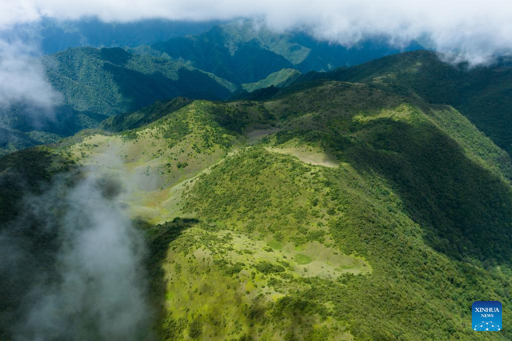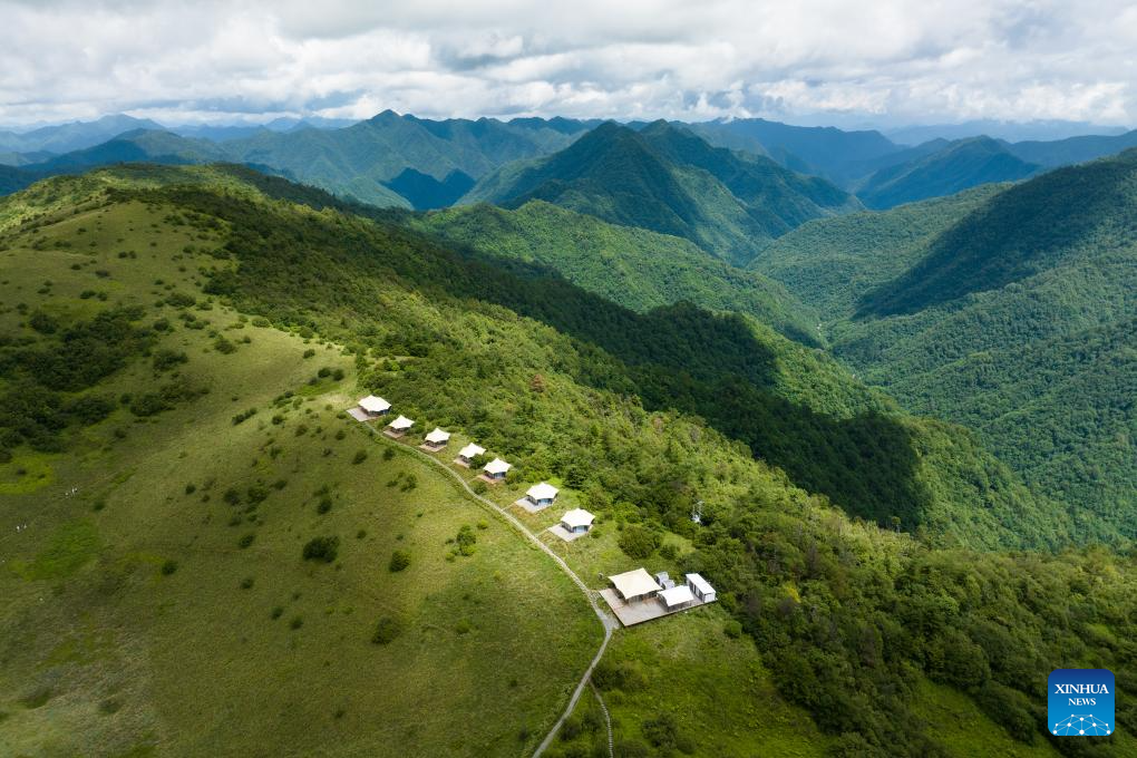 This aerial photo taken on Aug. 4, 2023 shows a view of Langao County, northwest China's Shaanxi Province. Located in the Qinba mountains of Shaanxi, the county of Langao has utilized its natural and cultural resources in recent years to promote high-quality development through tourism industry. In the first half of 2023, the county received more than four million tourists, up 63.65 percent year on year. (Xinhua/Shao Rui)