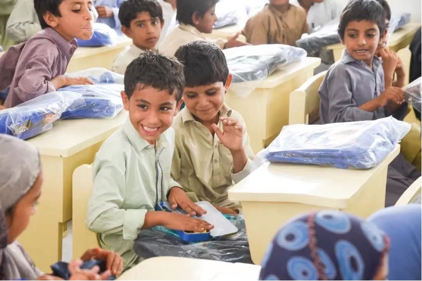 Students of a school in Gwadar, Pakistan donated by China Foundation for Peace and Development receive new stationery. (Photo by Xie Wenyuan)