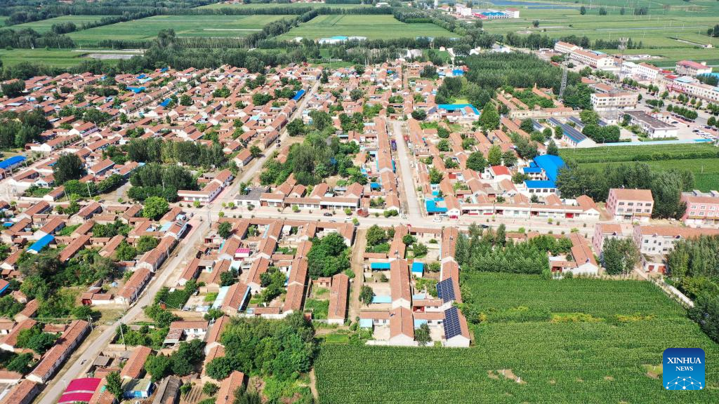 This aerial photo taken on Aug. 6, 2023 shows a view of the Wangdagua Village of Wangdagua Town in Pingyuan County, east China's Shandong Province. As of 7 a.m. Sunday, a total of 21 people have been injured in the 5.5-magnitude earthquake that struck the county of Pingyuan, in Dezhou City of east China's Shandong Province at 2:33 a.m. Sunday. A total of 126 buildings in the earthquake zone collapsed, while the transportation, communication and power supply there were normal, and no leak was discovered at oil and gas pipelines, according to local authorities. (Xinhua/Guo Xulei)