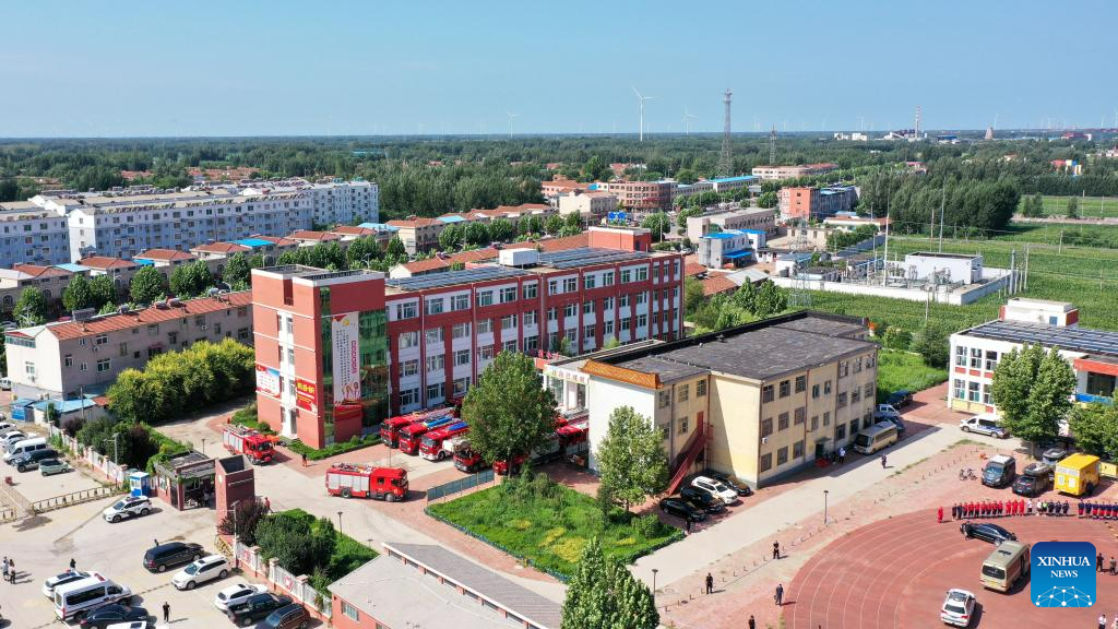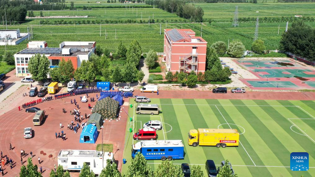 This aerial photo taken on Aug. 6, 2023 shows rescuers gathering at a playground of a primary school in Wangdagua Town of Pingyuan County, east China's Shandong Province. As of 7 a.m. Sunday, a total of 21 people have been injured in the 5.5-magnitude earthquake that struck the county of Pingyuan, in Dezhou City of east China's Shandong Province at 2:33 a.m. Sunday. A total of 126 buildings in the earthquake zone collapsed, while the transportation, communication and power supply there were normal, and no leak was discovered at oil and gas pipelines, according to local authorities. (Xinhua/Guo Xulei)