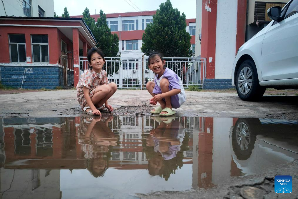 Children play in Wangdagua Town of Pingyuan County, east China's Shandong Province, Aug. 6, 2023. As of 7 a.m. Sunday, a total of 21 people have been injured in the 5.5-magnitude earthquake that struck the county of Pingyuan, in Dezhou City of east China's Shandong Province at 2:33 a.m. Sunday. A total of 126 buildings in the earthquake zone collapsed, while the transportation, communication and power supply there were normal, and no leak was discovered at oil and gas pipelines, according to local authorities. (Xinhua/Guo Xulei)