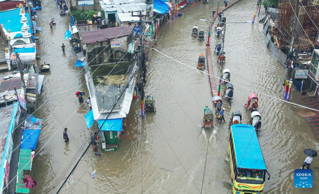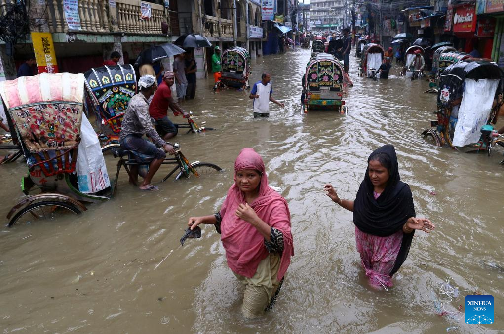 Pedestrians and rickshaws wade through a waterlogged street at a low-lying area in Chattogram, Bangladesh, Aug. 6, 2023. Days of torrential rain lashed the Bangladesh's seaport city Chattogram, some 242 km southeast of capital Dhaka, inundating low-lying areas and disrupting road traffic. (Xinhua)