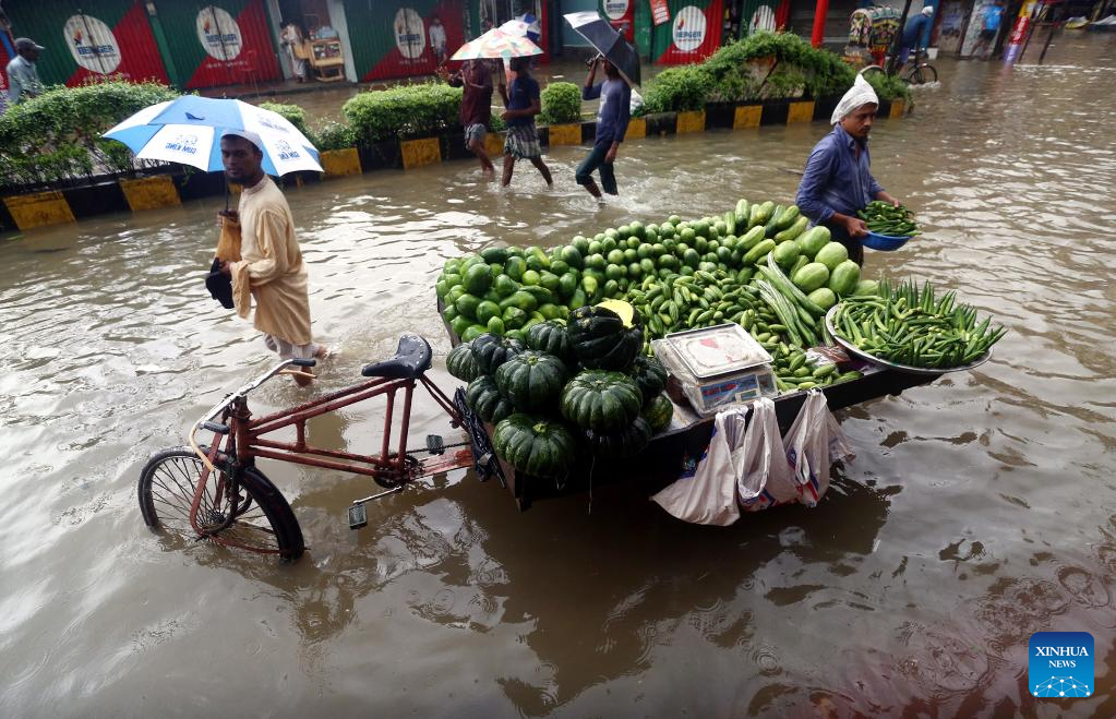 A vendor sells vegetables from a rickshaw van in a waterlogged street in Chattogram, Bangladesh, Aug. 6, 2023. Days of torrential rain lashed the Bangladesh's seaport city Chattogram, some 242 km southeast of capital Dhaka, inundating low-lying areas and disrupting road traffic. (Xinhua)