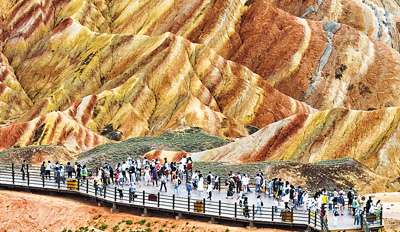 Photo shows tourists in the Danxia scenic area in Zhangye city, northwest China's Gansu Province. (People's Daily Online/Yin Xu)