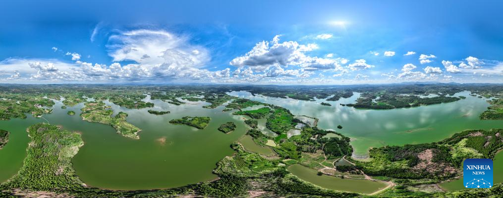 This aerial panoramic photo taken on Aug. 6, 2023 shows the scenery of Chongling National Wetland Park in Guiyang County, Chenzhou City, central China's Hunan Province. (Photo by Zhou Xiuyuchun/Xinhua)