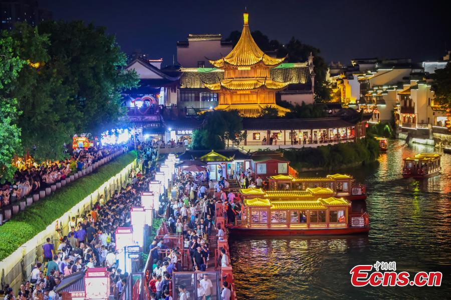 Tourists visit Fuzimiao historic district of Nanjing, east China's Jiangsu Province, Aug. 6, 2023. Illuminated Qinhuai River reflects the prosperity of a capital of six Chinese dynasties in ancient China. (Photo: China News Service/Yang Bo)