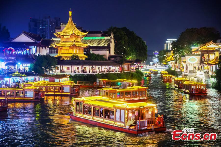 Sightseeing boats sail on Qinhuai River in the famous Fuzimiao (Confucius Temple) historic district of Nanjing, east China's Jiangsu Province, Aug. 6, 2023. Illuminated Qinhuai River reflects the prosperity of a capital of six Chinese dynasties in ancient China. (Photo: China News Service/Yang Bo)