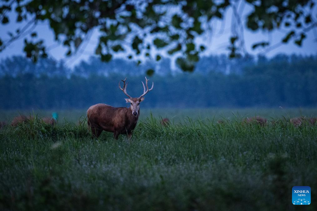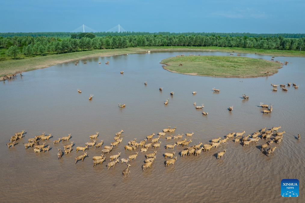 After years of efforts by protectors and continuous improvement of the local ecological environment, the population of milu deer at the nature reserve has increased rapidly, nearing 2,000 to date. There are more than 10 naturally formed breeding groups in varying sizes among these milu deer, and more baby milu deer are expected to come to the world after mating season this year.