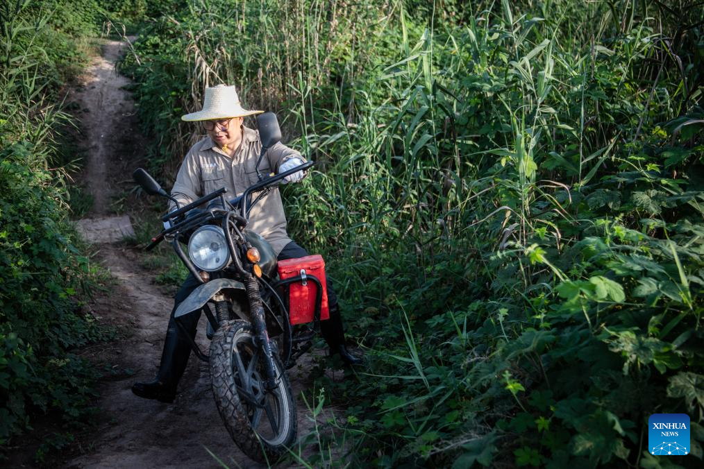 Ranger Wang Chuanjun patrols in Shishou Milu Deer National Nature Reserve in central China's Hubei Province, Aug. 1, 2023. (Xinhua/Wu Zhizun)