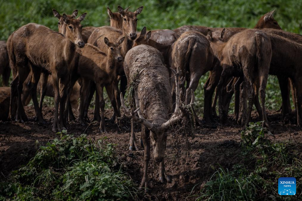 This photo taken on Aug. 1, 2023 shows milu deer at Shishou Milu Deer National Nature Reserve in central China's Hubei Province. (Xinhua/Wu Zhizun)