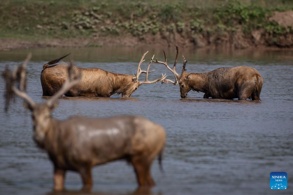 Two male milu deer fight at Shishou Milu Deer National Nature Reserve in central China's Hubei Province, Aug. 1, 2023. (Xinhua/Wu Zhizun)