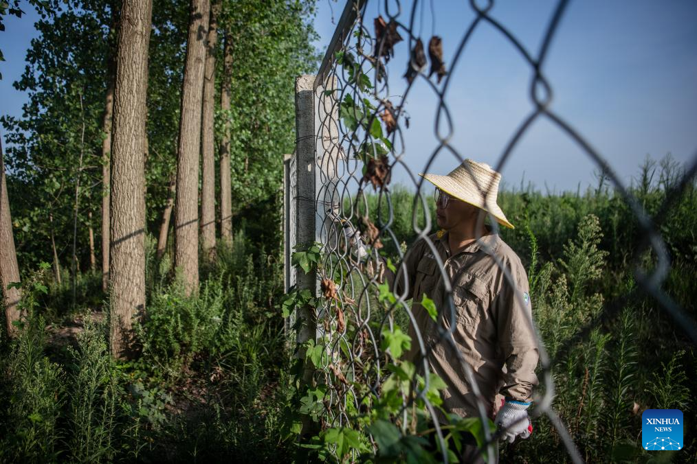 Ranger Wang Chuanjun fixes a humanly broken fence at Shishou Milu Deer National Nature Reserve in central China's Hubei Province, Aug. 1, 2023. (Xinhua/Wu Zhizun)