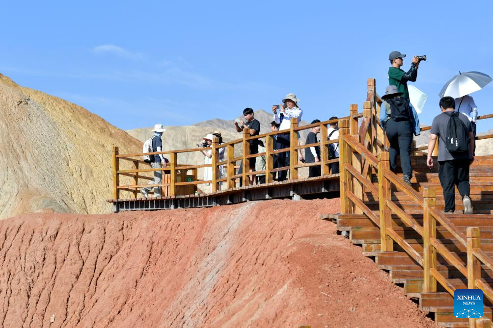 Tourists visit the Danxia National Geological Park in Zhangye, northwest China's Gansu Province, Aug. 7, 2023. Boasting a unique type of geomorphology formed from red-colored sandstones and characterized by steep cliffs, the Danxia National Geological Park has attracted an average of over 35,000 visitors daily since August. (Xinhua/Ma Ning)