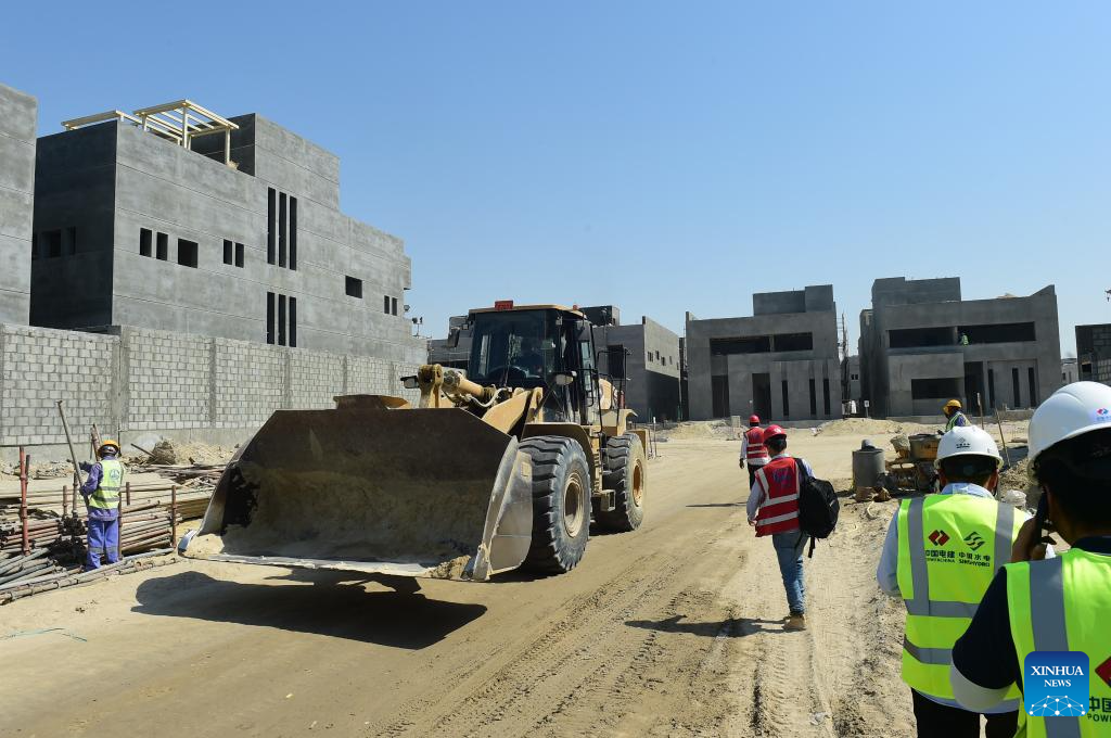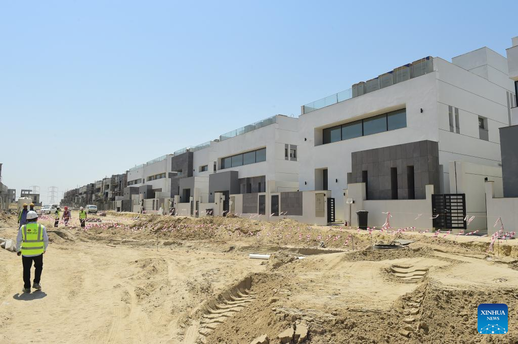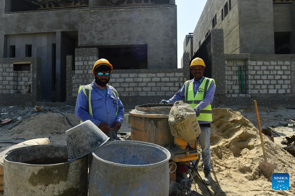 Workers are seen at the construction site of a housing project undertaken by Chinese enterprises in Ahmadi Governorate, Kuwait, Aug. 6, 2023. The housing project, jointly constructed by Power Construction Corporation Of China (PowerChina) and China Railway Group Limited (CREC), is located in Ahmadi Governorate. With 597 residential buildings and stores, as well as other infrastructure constructions, the total area is approximately 630,000 square meters. The project is planed to be completed in 2024. (Xinhua/Yin Ke)