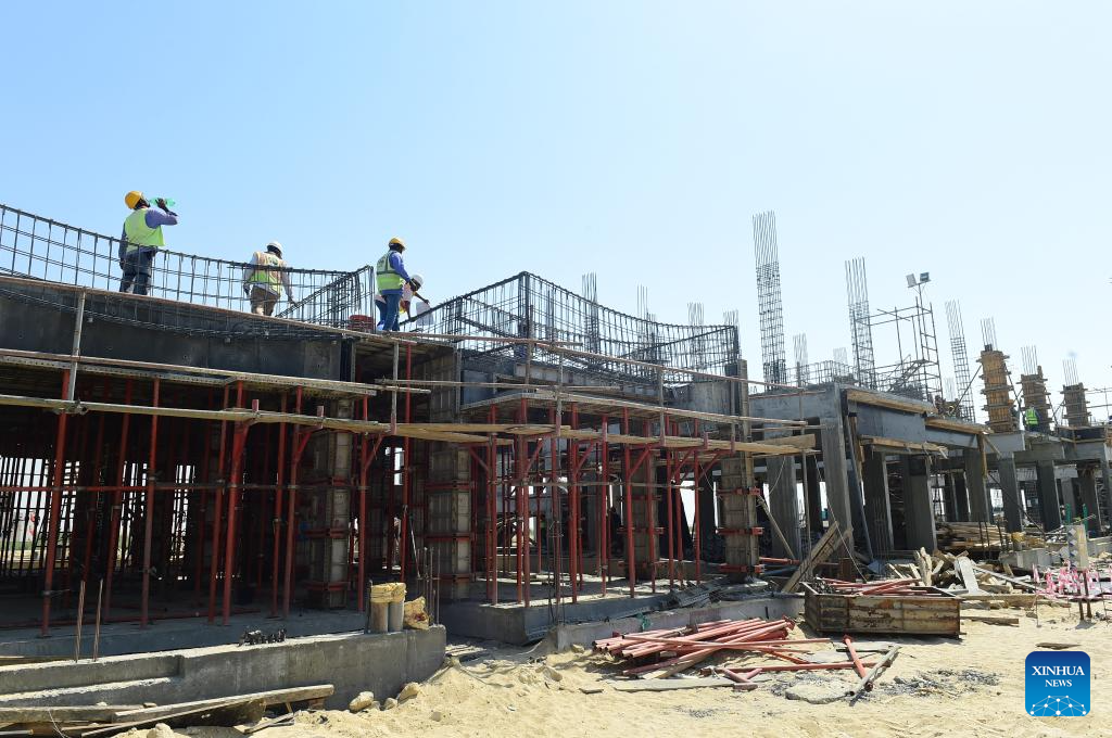 Workers work at the construction site of a housing project undertaken by Chinese enterprises in Ahmadi Governorate, Kuwait, Aug. 6, 2023. The housing project, jointly constructed by Power Construction Corporation Of China (PowerChina) and China Railway Group Limited (CREC), is located in Ahmadi Governorate. With 597 residential buildings and stores, as well as other infrastructure constructions, the total area is approximately 630,000 square meters. The project is planed to be completed in 2024. (Xinhua/Yin Ke)