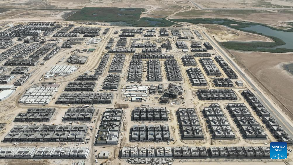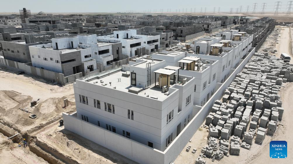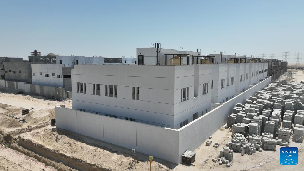 This aerial photo taken on Aug. 6, 2023 shows a housing project undertaken by Chinese enterprises in Ahmadi Governorate, Kuwait. The housing project, jointly constructed by Power Construction Corporation Of China (PowerChina) and China Railway Group Limited (CREC), is located in Ahmadi Governorate. With 597 residential buildings and stores, as well as other infrastructure constructions, the total area is approximately 630,000 square meters. The project is planed to be completed in 2024. (Photo by Gong Lingyu/Xinhua)