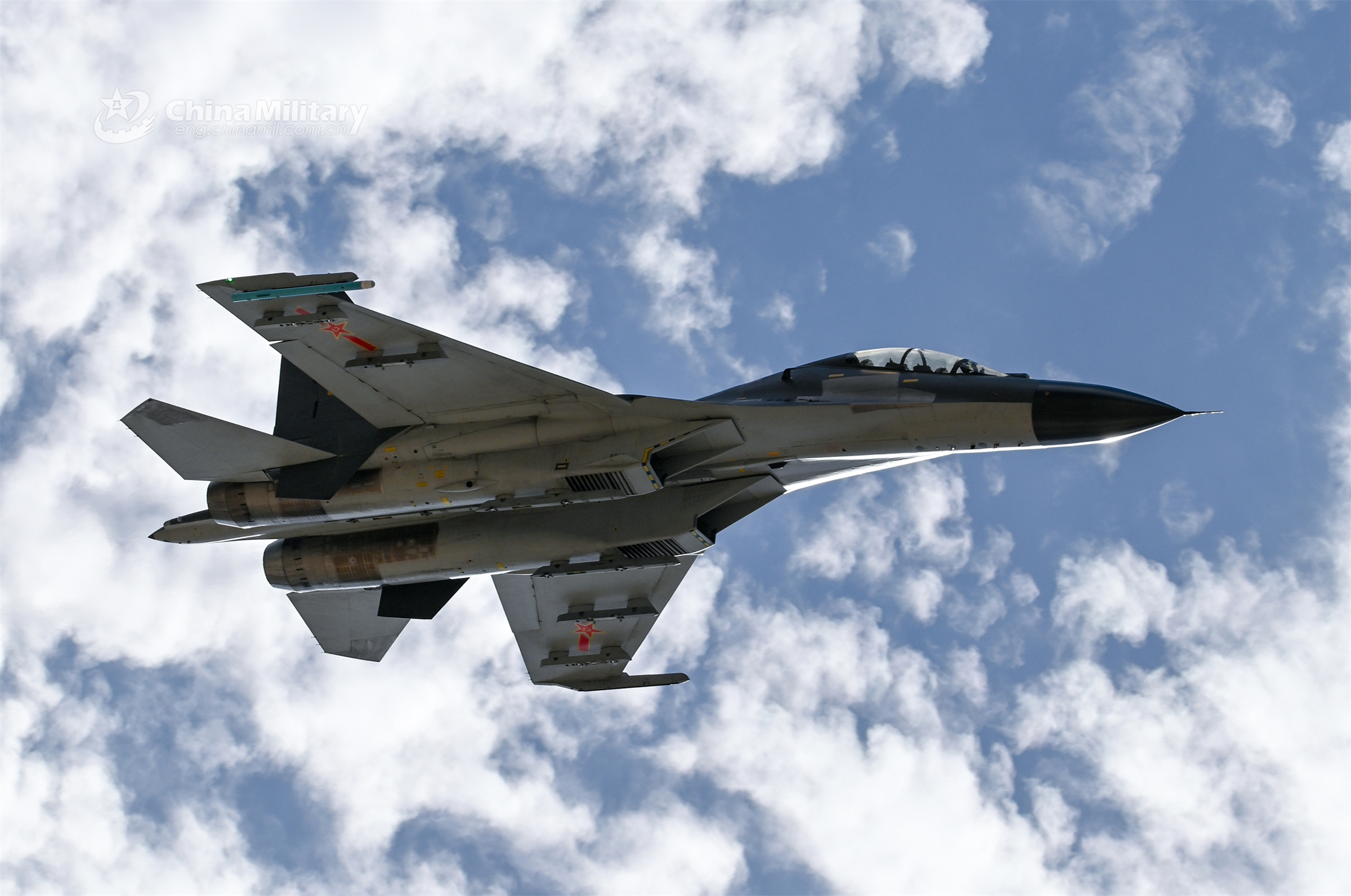 A fighter jet attached to an aviation brigade of the air force under the PLA Western Theater Command soars into the sky during a flight training exercise on July 30, 2023. (eng.chinamil.com.cn/Photo by Yu Zeqi)