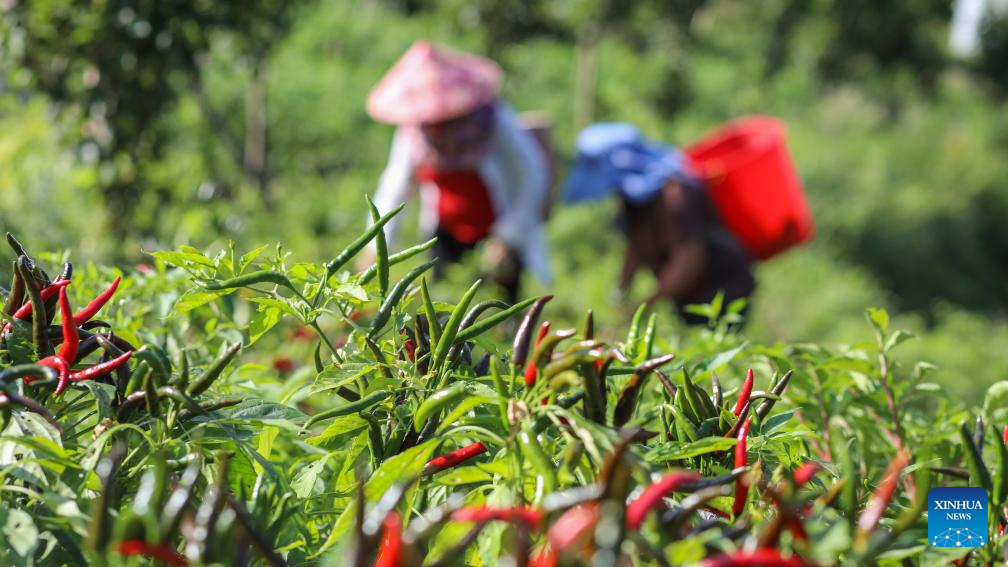 Farmers harvest chili peppers at a chili planting base in Nanshao Township of Jianhe County, southwest China's Guizhou Province, Aug. 7, 2023. Tuesday marks "Liqiu", or the beginning of autumn, the first day of autumn on the Chinese lunar calendar. Farmers in different areas of the country are busy with harvesting. (Photo by Wan Wenjie/Xinhua)