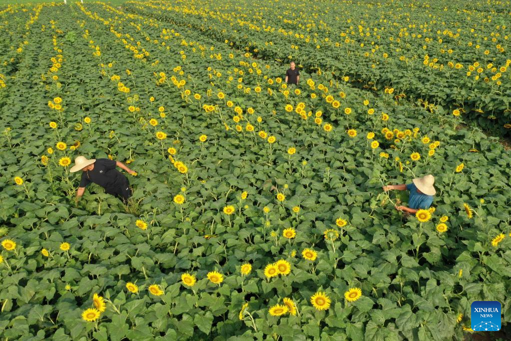 This aerial photo taken on Aug. 7, 2023 shows farmers working in an oil sunflower field in Wenxian County of Jiaozuo City, central China's Henan Province. Tuesday marks "Liqiu", or the beginning of autumn, the first day of autumn on the Chinese lunar calendar. Farmers in different areas of the country are busy with harvesting. (Photo by Xu Hongxing/Xinhua)