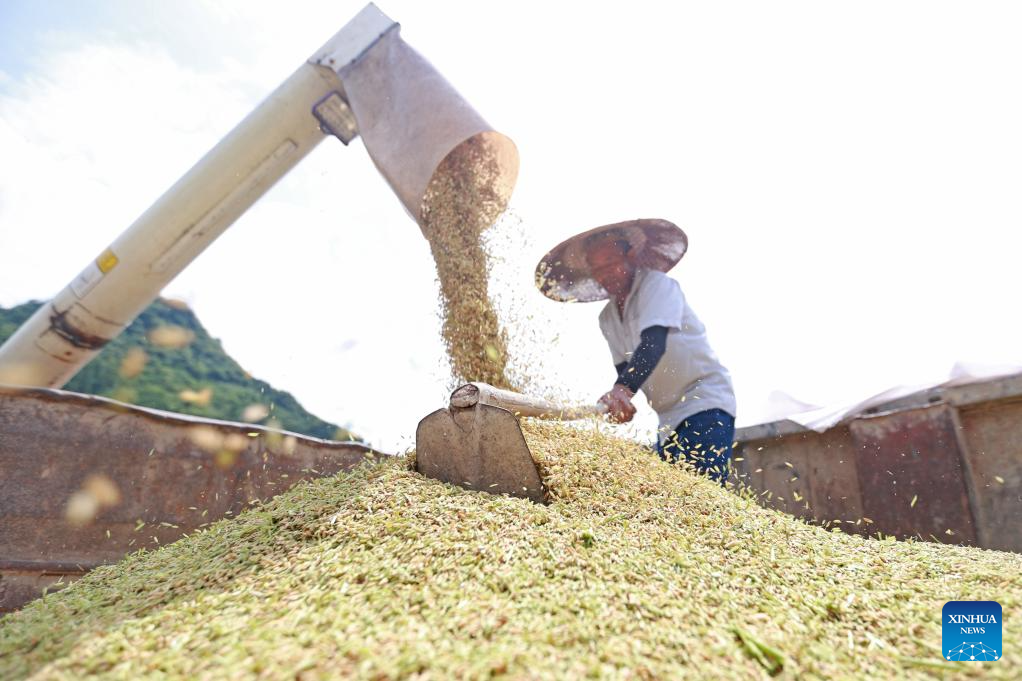 A farmer loads rice on a vehicle at a hybrid rice seed production base in Zhuxi Township of Cengong County, southwest China's Guizhou Province, Aug. 7, 2023. Tuesday marks "Liqiu", or the beginning of autumn, the first day of autumn on the Chinese lunar calendar. Farmers in different areas of the country are busy with harvesting. (Photo by Tang Peng/Xinhua)