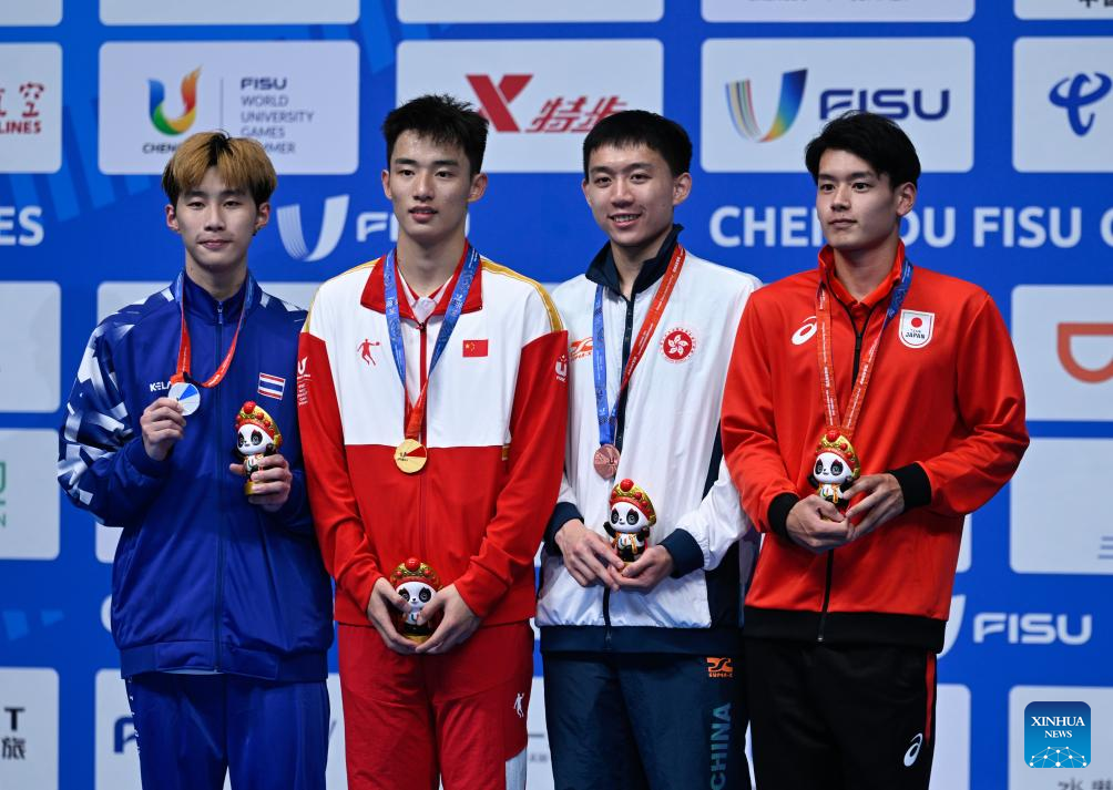 Gold medalist China's Wang Zhengxing (2nd L), silver medalist Thailand's Panitchaphon Teeraratsakul (1st L), bronze medalist Ko Shing Hei (2rd R) of China's Hong Kong and Japan's Noda Toma pose during the awarding ceremony after the men's Singles Final match of badminton at the 31st FISU Summer World University Games in Chengdu, southwest China's Sichuan Province, Aug. 7, 2023. (Xinhua/Jigme Dorje)