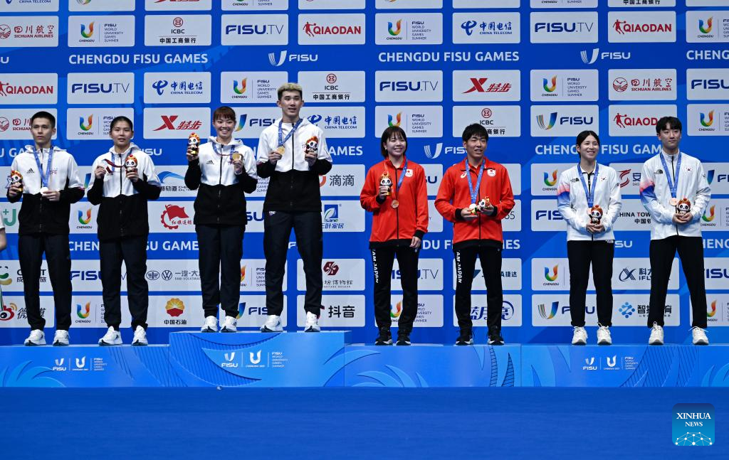 Gold medalists Ye Hong-wei (4th L)/Lee Chia-hsin (3rd L) of Chinese Taipei, silver medalists Lee Fang-chih (1st L)/Teng Chun Hsun (2nd L) of Chinese Taipei, bronze medalists Takiguchi Yuto (4th R)/Uemura Rio (3rd R) of Japan and Jin Yong (2nd R)/Ji Youngbin of South Korea attend the awarding ceremony for badminton mixed doubles at the 31st FISU Summer World University Games in Chengdu, southwest China's Sichuan Province, Aug. 7, 2023. (Xinhua/Jigme Dorje)
