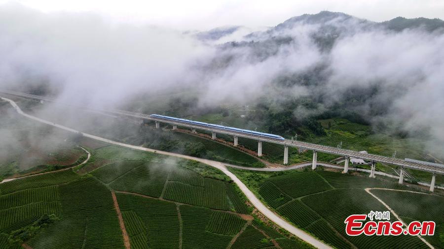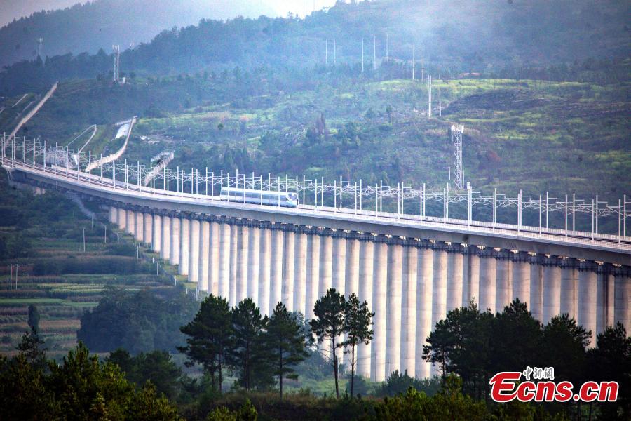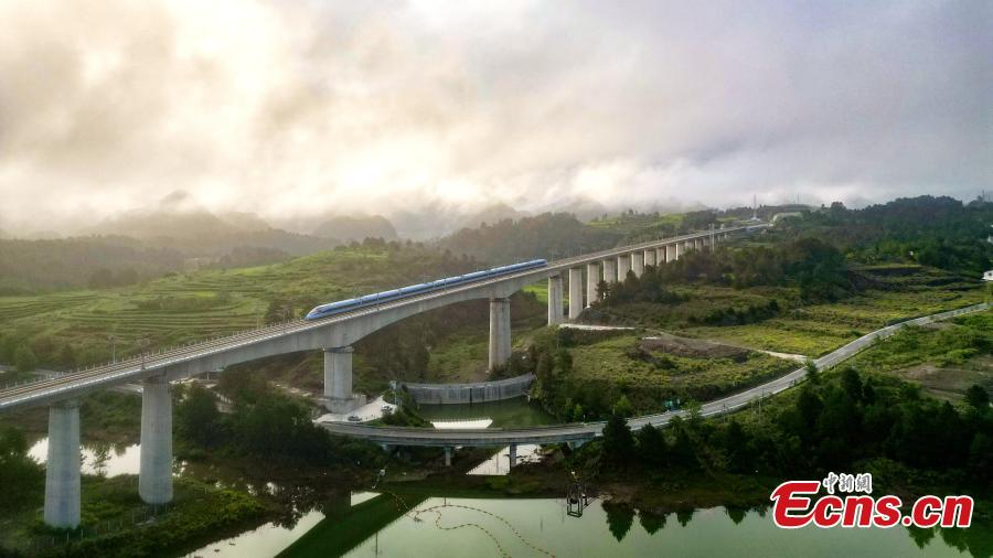 The first high-speed train D6171 runs on Gengzhuang Grand Bridge in southwest China's Guizhou Province, Aug. 8, 2023. (Photo: China News Service/Cai Chaoyang)