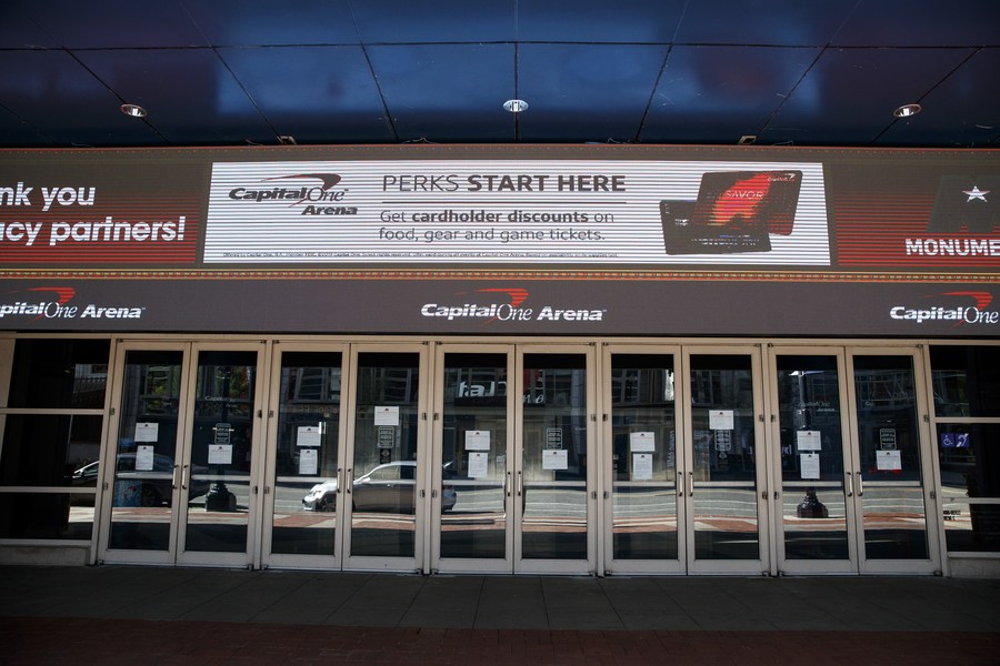 The Capital One Arena is closed amid the COVID-19 pandemic in Washington D.C., the United States, on April 16, 2020. (Photo by Ting Shen/Xinhua)
