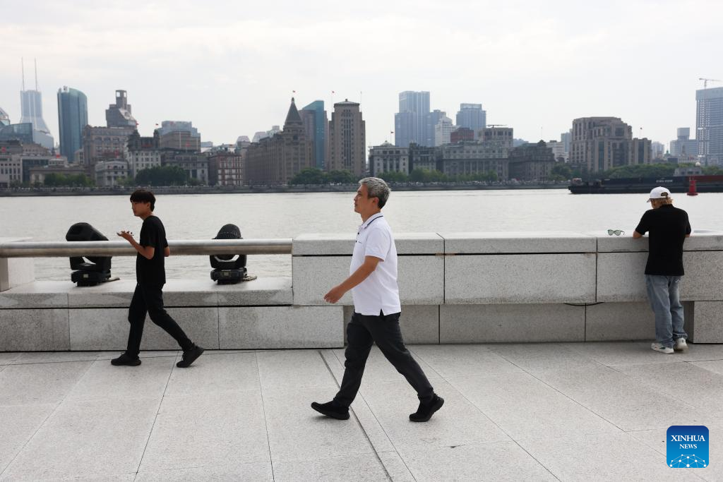 Peng Chengzhi walks alongside a river in Pudong District of east China's Shanghai, July 22, 2023. (Xinhua/Jin Liwang)