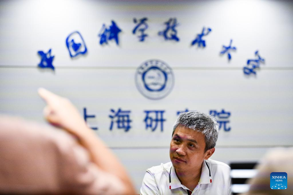 Peng Chengzhi (L front) attends a meeting at the Shanghai Institute for Advance Studies of the University of Science and Technology of China in east China's Shanghai, July 22, 2023. (Xinhua/Wang Xiang)