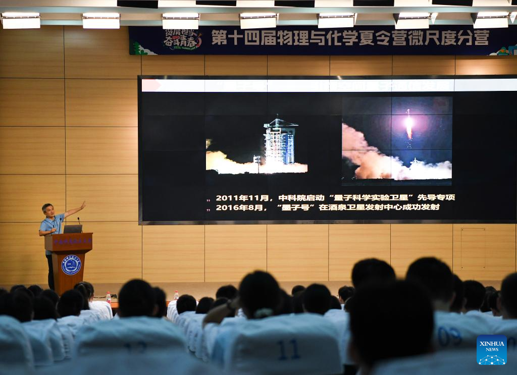 Peng Chengzhi speaks during a lecture in the University of Science and Technology of China in Hefei, east China's Anhui Province, July 21, 2023. (Xinhua/Qian Yi)