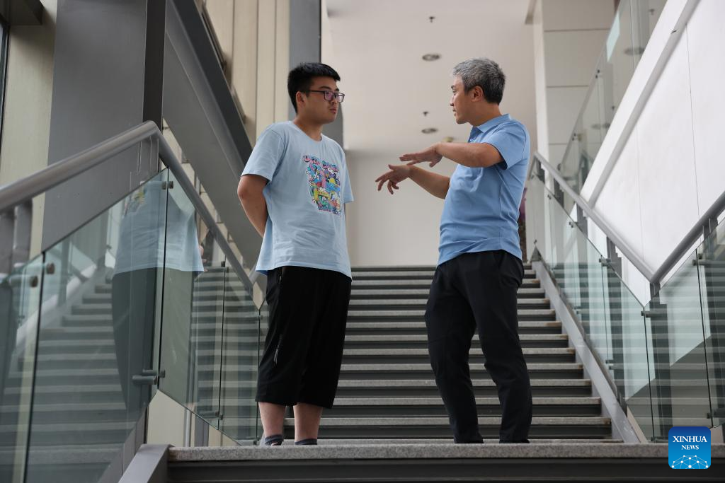Peng Chengzhi (L) talks with Professor Ren Jigang at the Institute of Advance Technology of the University of Science and Technology of China in Hefei, east China's Anhui Province, July 21, 2023. (Xinhua/Jin Liwang)